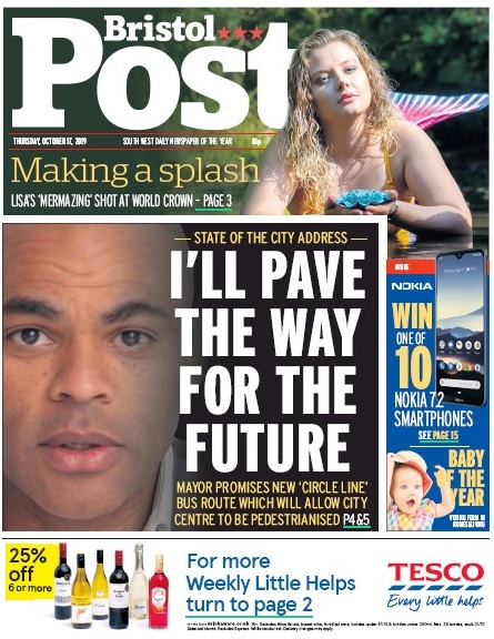 The front page depicted the mayor, Marvin Rees, in a closely cropped image.