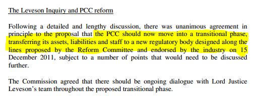 “Following a detailed and lengthy discussion, there was unanimous agreement in principle to the proposal that the PCC should now move into a transitional phase, transferring its assets, liabilities and staff to a new regulatory body designed along the lines proposed by the Reform Committee and endorsed by the industry on 15 December 2011, subject to a number of points that would need to be discussed further.