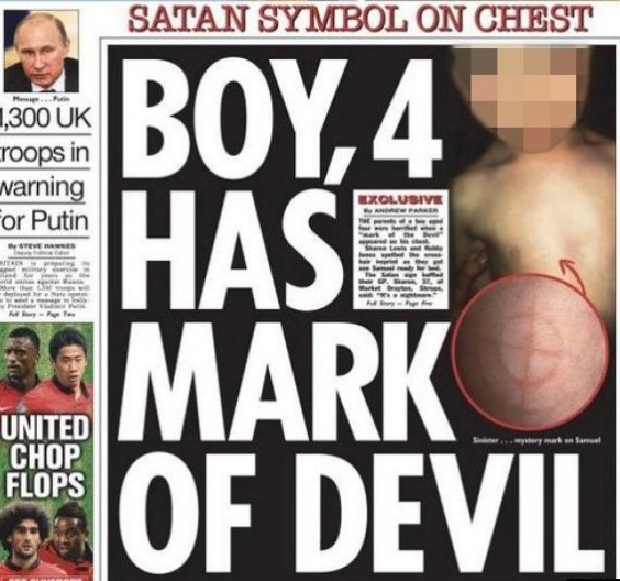 The article said, “A sinister Satan sign that mysteriously appeared on a four-year-old boy is proving a devil to explain.” The Sun quoted the boy’s “shocked” mother saying “Just looking at it made me shake thinking something unnatural had visited my boy.”