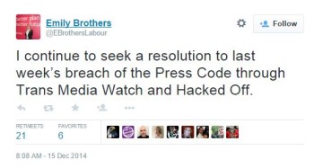 Brothers also thanked Trans Media Watch and everyone who supported her in response to the Liddle column. She noted that “I believe strongly in press freedom” and that she wants “more effective press regulation” so that the regulator could order an apology. “We want respect and to stop the mocking,” she stated.