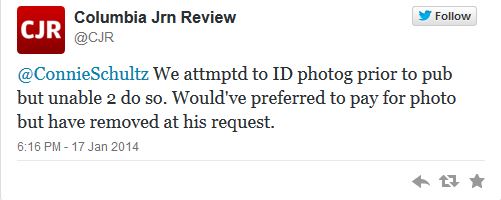 “I contacted CJR Friday afternoon and, pretty soon I got an email from Greg Marx, a CJR editor: “Thanks for your note. We did make an effort to identify the creator of the photograph (in addition to verifying authenticity) as part of our reporting process but were unable to do so.”