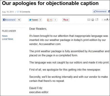 Gannett-owned The News Leader apologized August 19 for publishing the f-word in its “print weather package.”