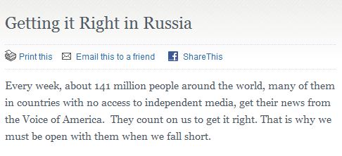 “Yes, doing business in Russia is tough. We live in a digital age where identities are faked and websites hacked. By summer 2008, pressure from the Putin administration had forced VOA programs off the Russian radio and television stations that once carried them. Since then our Russian service has created a vibrant and dynamic website to reach out to this important audience, and we intend to keep offering accurate, balanced and comprehensive coverage that is not available from state controlled media.”