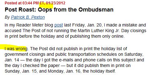 According to Pexton’s Jan. 23 “oops” blogpost correcting his error, his original Jan. 20 blogpost “accused the Post of not running the Martin Luther King Jr. Day closings in print before the holiday and of only publishing them online.”