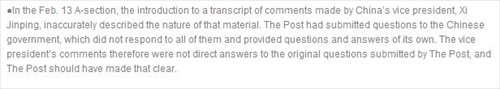“Correction: The introduction to a transcript published Monday of comments made by China’s vice president, Xi Jinping, inaccurately described the nature of that material. The Post had submitted questions to the Chinese government, which did not respond to all of them and provided questions and answers of its own. The vice president’s comments therefore were not direct answers to the original questions submitted by The Post, and The Post should have made that clear.”