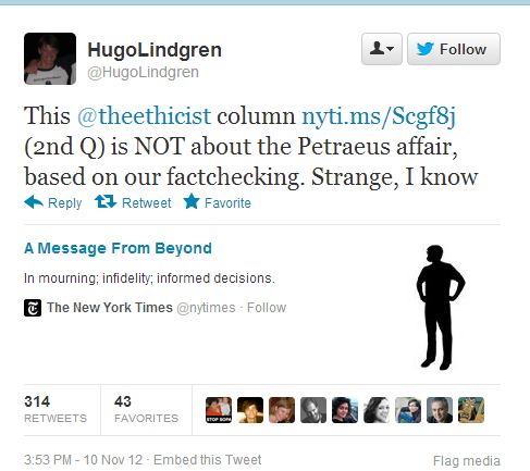 “This @theethicist column http://nyti.ms/Scgf8j (2nd Q) is NOT about the Petraeus affair, based on our factchecking. Strange, I know”