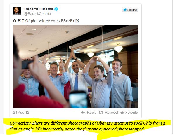 In an August 22 tweet, the Washington Post wrote: “Correction re: that Obama photo. We were fooled,” with a link to this Washington Post blogpost on the photos of Obama with three others using their arms to form the letters “O-H-I-O.”