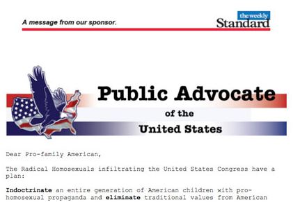 See here Media Bistro’s Jan. 5 article on the e-mail, which Media Bistro described as “on behalf of an advertiser regarding a government mandate to educate people on homosexuality.” The e-mail was addressed to “Pro-family American” and claimed, in part, that