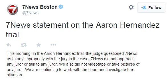 In a statement, WHDH said “7News did not approach any juror or talk to any juror. We also did not videotape or take pictuers of any juror.”