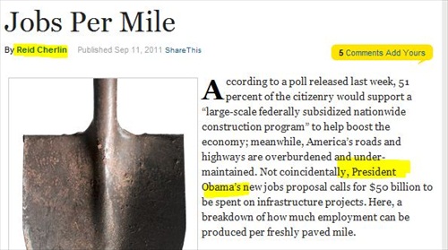 In question are these two articles: Sept. 11, 2011’s “Jobs per Mile” about President Obama’s new jobs proposal; and July 22, 2011’s “38 Minutes with Elizabeth Warren”