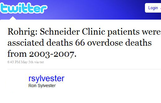 EXCLUSIVE, Special Report, Part 1: Wichita Eagle reporter Ron Sylvester’s claim to fame might be his four years as a director for the Society of Professional Journalists or his run for its presidency in 2008. Or even, most recently, it may be his innovation of live tweeting from court. He has extensively covered the cases involving Stephen and Linda Schneider, whose clinic The Associated Press reported May 12, 2010, has been “linked to 68 alleged overdose deaths.”