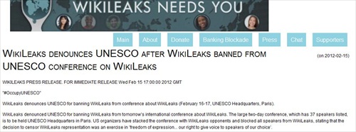 WikiLeaks issued a Feb. 15 press release announcing that is “denounces UNESCO after WikiLeaks Banned from UNESCO conference on WikiLeaks.” Assange called for people to “Occupy UNESCO.” WikiLeaks claimed that the conferences’ “US organizers have stacked the conference with WikiLeaks opponents and blocked all speakers from WikiLeaks.”
