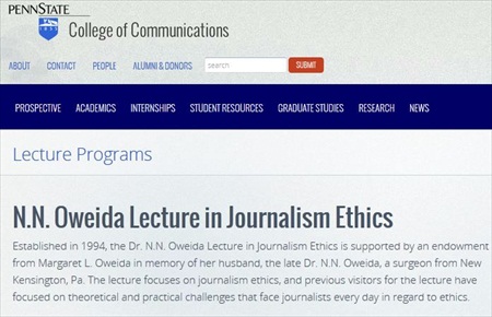 Penn State’s College of Communications’ Lecture Programs webpage explains of the annual lecture, the Dr. N.N. Oweida Lecture in Journalism Ethics: