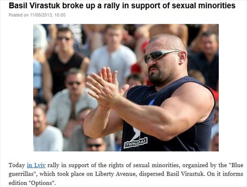According to Russian news site Lenta.ru, the Russia Today article was titled “World’s Strongest Man accidentally broke up a rally of gays in Lviv” (or Самый сильный человек планеты случайно разогнал митинг геев во Львове).
