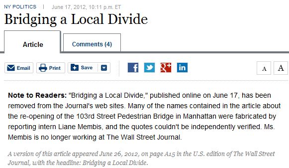 Talking Biz News quoted a spokesperson for the Wall Street Journal who said Membis interned for “less than three weeks and wrote or contributed to five published pieces, one of which has been removed from our online archives and two of which have been edited to remove quotes that were provided by the intern and that cannot be confirmed.” Poynter’s Andrew Beaujon noted that the two other articles are June 6’s “Space Shuttle Floats Into Its Manhattan Home” and June 10’s “Stop, Frisk in Spotlight.”