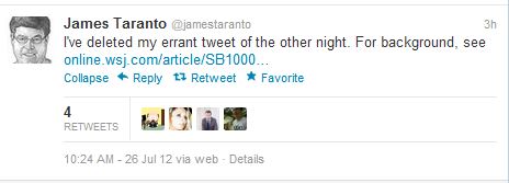 The Wall Street Journal’s James Taranto spent about 1,000 words explaining and apologizing for a 15-word July 24 tweet about victims in the Aurora, Colorado “Dark Knight Rises” shooting.