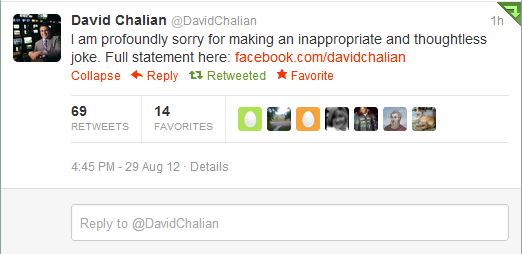 “David Chalian’s statement was inappropriate and does not represent the views of Yahoo!. He has been terminated effective immediately. We have already reached out to the Romney campaign, and we apologize to Mitt Romney, his staff, their supporters and anyone who was offended.”