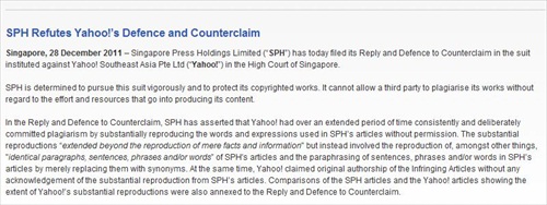 In a Dec. 28 post on Singapore Press Holdings’ website, the company said it “filed its Reply and Defence to Counterclaim” by Yahoo. In the post, Singapore Press Holdings reiterated its claim that Yahoo plagiarized and infringed its copyright. Singapore Press Holdings added that the accused content isn’t just facts but “identical paragraphs, sentences, phrases and/or words.”