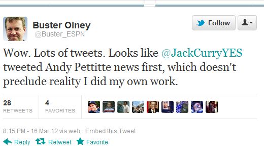 Olney noted about eight hours after the news broke that Curry did tweet the news first, that he “had no idea” Curry tweeted it first but that it “doesn’t preclude reality I did my own work.” Olney added that he is “looking forward to YES crediting ESPN” and noted that the “NYPost, NYTimes, Record, other stories don’t credit NYY network for Pettitte news.” (The New York Post’s March 16 story, the New York Times ‘March 16 story, and The Bergen (NY) Record’s March 16 story all reported on the news of Pettitte’s deal but didn’t say who broke the story.)